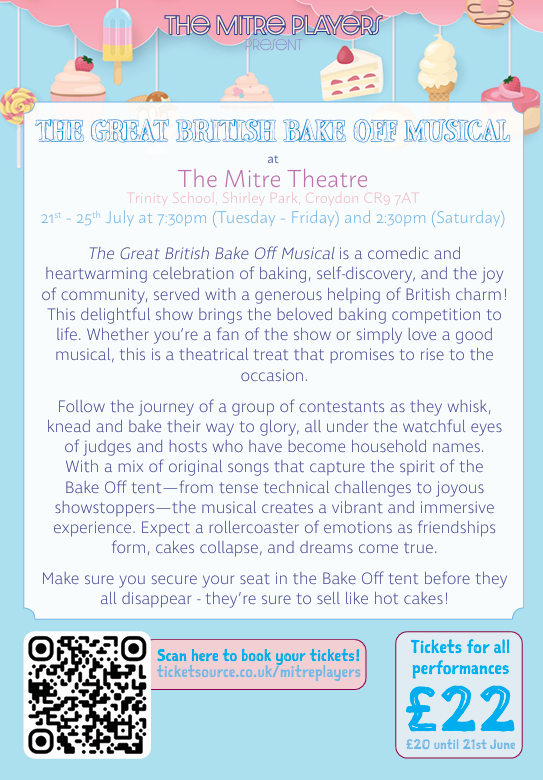 Jerri-Lee McManus will introduce her plans for our entry to the 2025 Southern Counties Drama Festival, for which we have won many accolades in recent years, and we will also reveal our new and exciting plans for our Spring show. Unfortunately, we’re no longer able to put Into the Woods on in 2025 and must therefore postpone our plans there, but rest assured that more Mitre magic will be forthcoming next April and we’ll be able to tell you all about it on the 17th!
